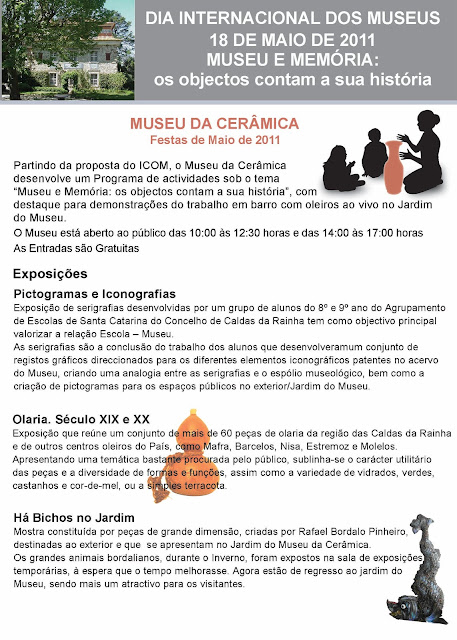 O Museu da Cerâmica comemorou o Dia Internacional dos Museus com demonstrações do trabalho do barro manualmente e na roda, com a presença de oleiros ao vivo no Jardim do Museu. Esta acção teve a participação do CENCAL – Centro de Formação Profissional para a Indústria Cerâmica, com 15 formandos e professores – Dra. Maria de Jesus Sheriff e Dr. Paulo Óscar –, e com ceramistas locais – Bolota e Ana Sobral –, que muito contribuíram para a concretização e o êxito deste evento.